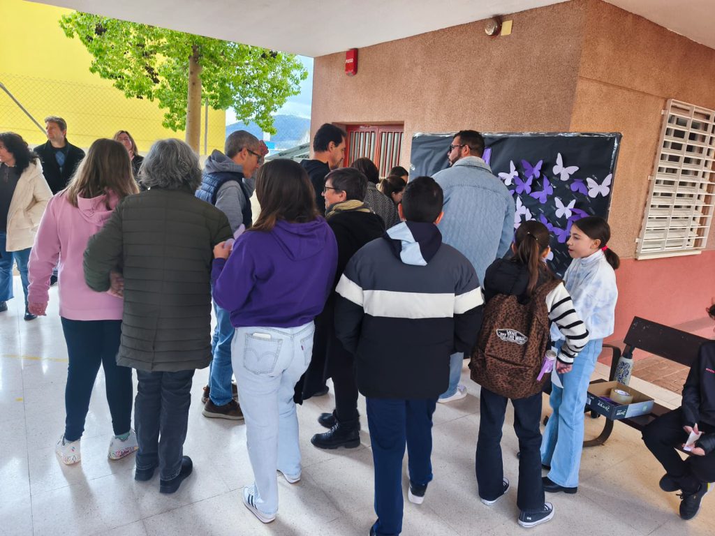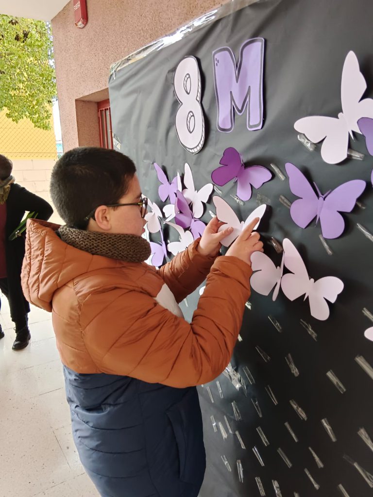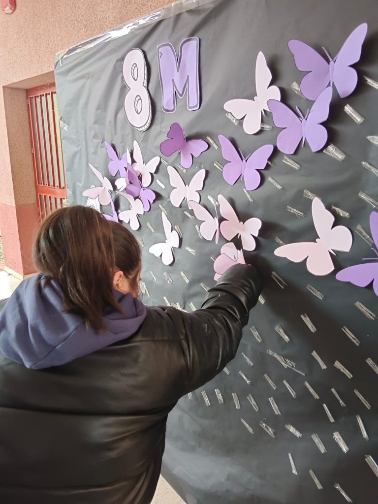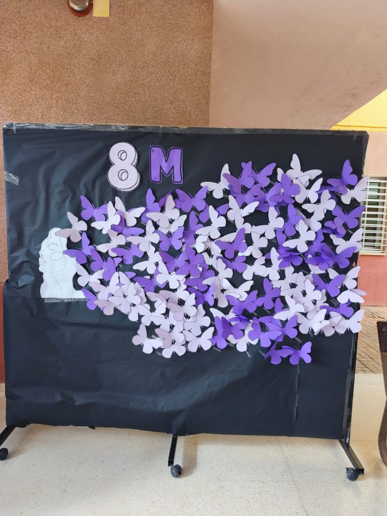 Después, toda la comunidad educativa participó en la creación de un mural colectivo 🎨🖌️ en el que cada persona pegó una mariposa 🦋, símbolo de la metamorfosis y de los cambios que, poco a poco, seguimos logrando en nuestra sociedad 🌍💜.